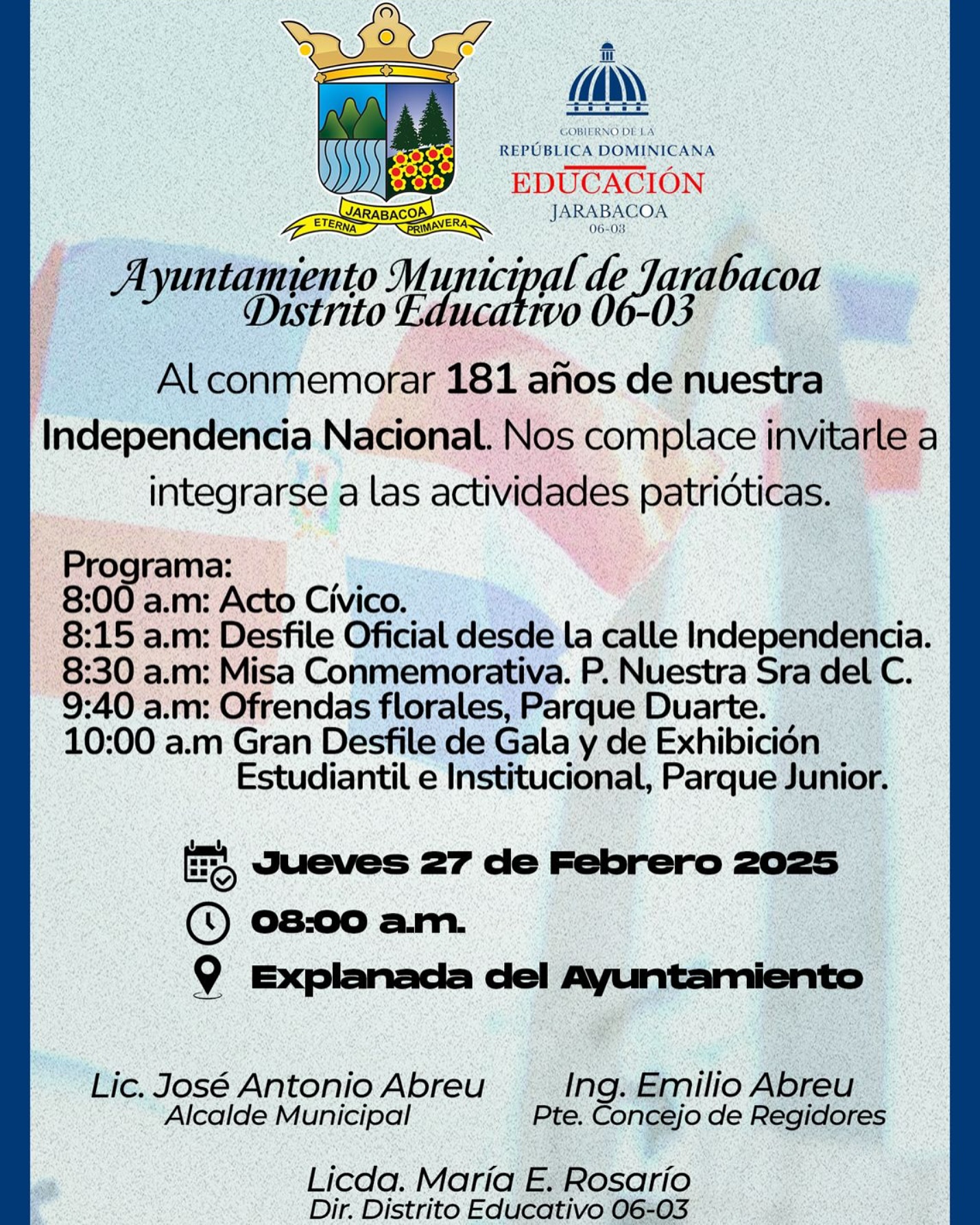 Ayuntamiento Municipal de Jarabacoa y el Distrito Educativo 06-03 invitan a toda la comunidad a conmemorar juntos los 181 años de nuestra Independencia Nacional.