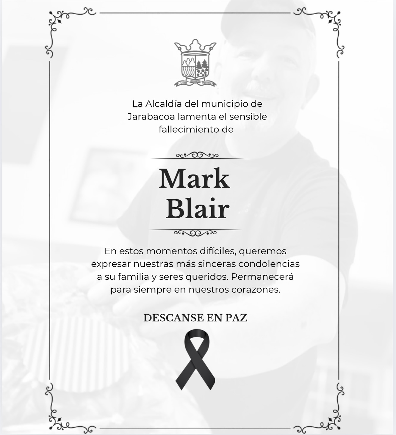 El Ayuntamiento Municipal de Jarabacoa comunica con profundo pesar el fallecimiento del esposo de nuestra querida Vicealcaldesa Dra. Alba Yris Rodríguez el señor Mark Blair, un increíble ser humano que hizo grandes aportes al municipio de Jarabacoa.