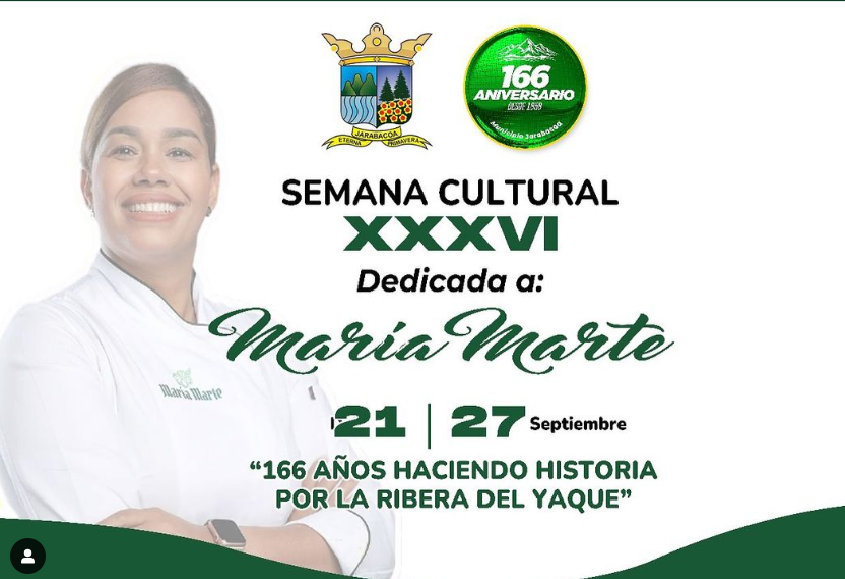 El Ayuntamiento Municipal de Jarabacoa anuncia la celebración de la 𝗫𝗫𝗫𝗩𝗜 𝗦𝗲𝗺𝗮𝗻𝗮 𝗖𝘂𝗹𝘁𝘂𝗿𝗮𝗹, del 21 al 27 de septiembre de 2024, en conmemoración del 𝟭𝟲𝟲 𝗮𝗻𝗶𝘃𝗲𝗿𝘀𝗮𝗿𝗶𝗼 𝗱𝗲 𝘃𝗶𝗱𝗮 𝗺𝘂𝗻𝗶𝗰𝗶𝗽𝗮𝗹. Este año, el evento estará dedicado a la reconocida Chef María Marte, oriunda de nuestro municipio y galardonada con dos estrellas Michellin, quien ha llevado el nombre de Jarabacoa por todo lo alto a escenarios internacionales, destacando la excelencia culinaria y siendo un motivo de orgullo para nuestro pueblo. Bajo el lema “𝟭𝟲𝟲 𝗮𝗻̃𝗼𝘀 𝗵𝗮𝗰𝗶𝗲𝗻𝗱𝗼 𝗵𝗶𝘀𝘁𝗼𝗿𝗶𝗮 𝗽𝗼𝗿 𝗹𝗮 𝗿𝗶𝗯𝗲𝗿𝗮 𝗱𝗲𝗹 𝗬𝗮𝗾𝘂𝗲”, esta semana resaltará la importancia de nuestra cultura, el turismo y la naturaleza, pilares fundamentales de nuestro municipio.