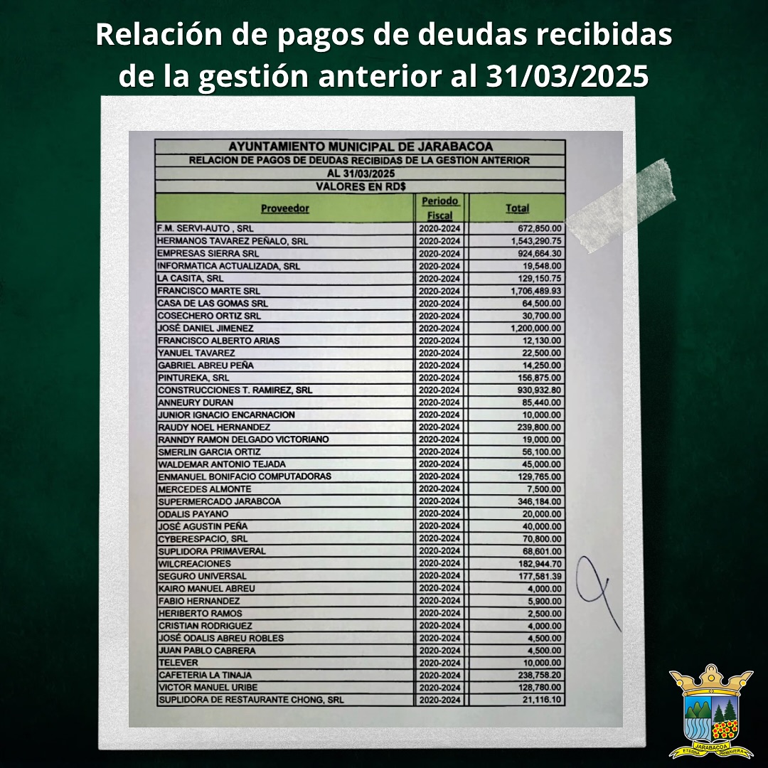 Durante nuestra primera rendición de cuentas, el pasado 24 de abril, informamos al pueblo de Jarabacoa que habíamos pagado más de 11 millones de pesos en deudas que fueron heredadas de la gestión anterior. Lo hicimos como muestra de nuestro compromiso con la continuidad y el respeto por las responsabilidades del Ayuntamiento.