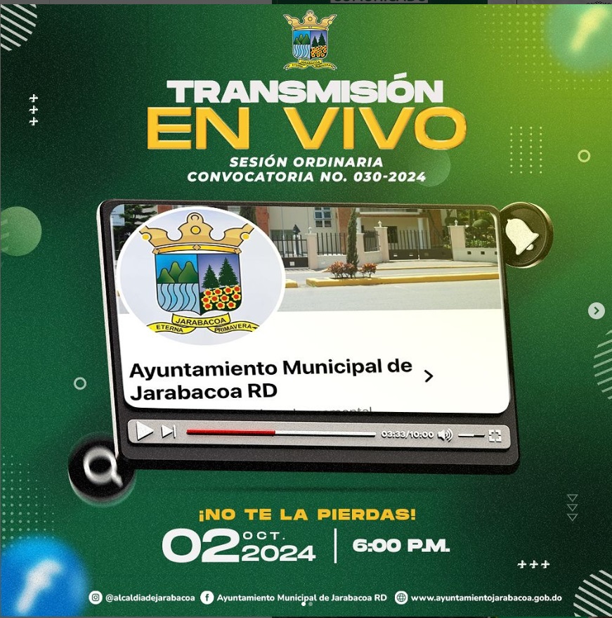 No te pierdas la Sesión Ordinaria que celebraremos este miércoles 2 de Octubre, a las 6:00 p.m, en la Sala Capitular del Ayuntamiento Municipal de Jarabacoa.